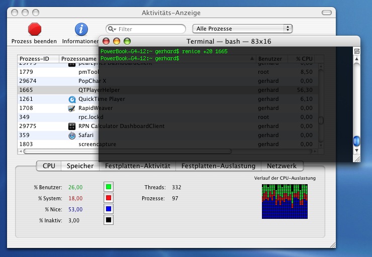 renice +20 1665Danach macht der Quicktime-Encoder nur noch was, wenn absolut gar kein anderer Prozess etwas zu rechnen hat. Anzumerken ist noch folgendes: